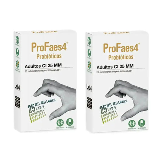 ProFaes4® Adults CI 25 MM é um suplemento alimentar concebido para manter o equilíbrio do microbiota intestinal dos adultos. Combina probióticos do consórcio Lab4 e prebióticos (fruto-oligossacáridos) para promover uma flora intestinal saudável. Cada cápsula fornece 12,5 mil milhões de bactérias activas, incluindo estirpes de Lactobacillus acidophilus e Bifidobacterium bifidum. Recomenda-se a toma de duas cápsulas por dia, de preferência após as refeições, evitando o consumo com líquidos ou alimentos quentes.
