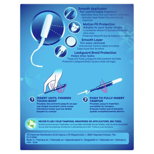 Dentro da marca Tampax existe outra linha de produtos que oferece um tampão diferente para se adaptar às diferentes fases do período. O Compak Superplus é o tampão ideal para quando há um fluxo intenso de sangue. É duas vezes mais absorvente do que o Tampax Compak Regular, este é indicado para quando o fluxo é normal e o Super é utilizado quando o fluxo é moderado ou abundante. É aconselhável utilizar sempre a absorção mínima para o fluxo que tem, em caso de dúvida deve utilizar o de menor absorção. Estes tampões têm um aplicador de plástico com uma ponta arredondada que torna a inserção higiénica e fácil. Os seus diferentes canais de absorção facilitam a captação do fluxo sanguíneo, oferecendo maior rapidez e segurança. Tem uma expansão em forma de V que optimiza a adaptação do fato ao corpo da mulher. Além disso, a sua saia protetora oferece uma proteção extra. Pode comprar estes tampões da Tampax a preços de farmácia na farmácia online ao domicílio Pharmaciesdirect.