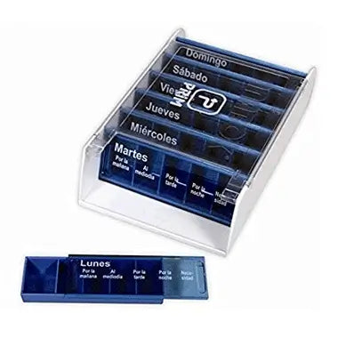 Caixa semanal de comprimidos Acofar com cortador concebida para classificar os tratamentos durante os sete dias da semana, diferenciando os dias com cores diferentes. Cada um dos sete recipientes vem com quatro compartimentos para organizar os diferentes comprimidos de acordo com a hora do dia.