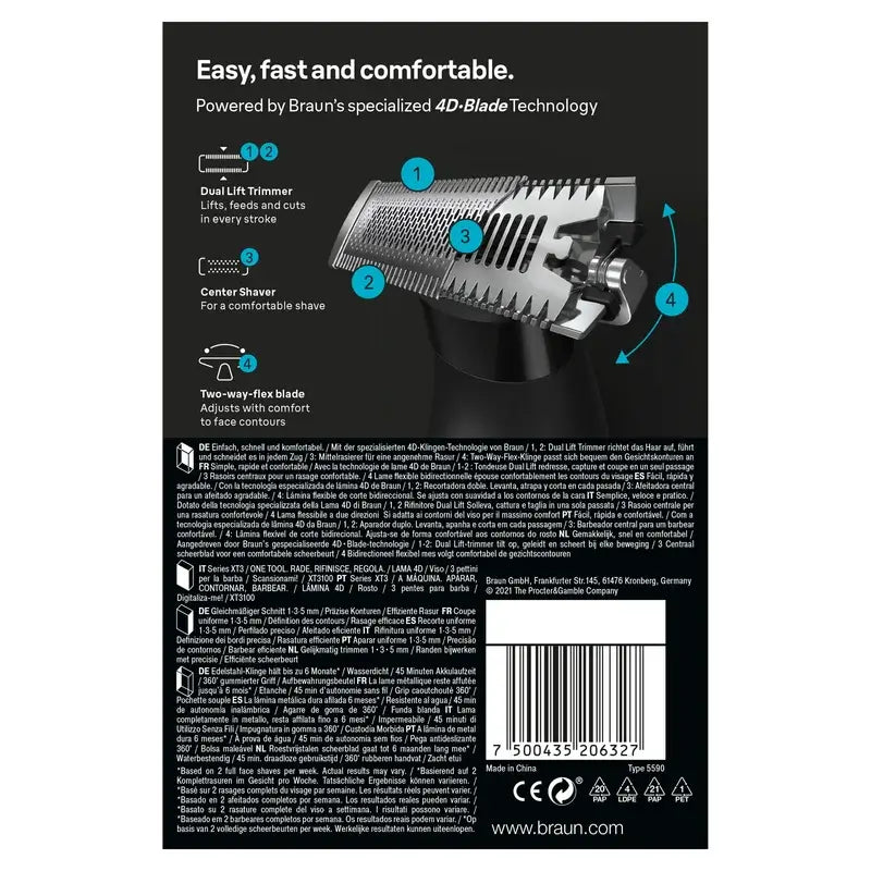 Faça a barba em qualquer direção com a Braun Series X.Conteúdo da caixa:1 aparador e máquina de barbear Series X1 folha 4D Flex3 pentes faciais (1 mm, 3 mm e 5 mm)1 capa de protecção1 estojo