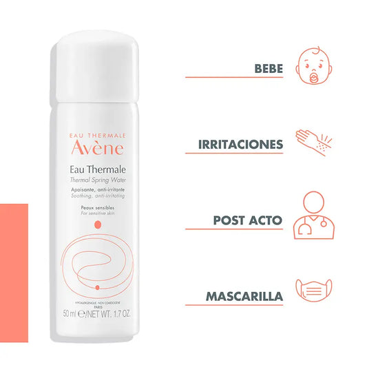 A Água Termal de Avène acalma instantaneamente a pele irritada. Enriquecida há mais de meio século, a Água Termal de Avène está repleta de minerais e oligoelementos para assegurar um equilíbrio mineral ótimo e uma microflora específica, o que lhe confere um carácter único e excecional que acalma a pele sem a secar e a torna um elemento central de qualquer rotina de beleza. Rico em sílica, proporciona suavidade e conforto para uma sensação imediata de bem-estar em cada aplicação. Indicado para todos os tipos de pele.