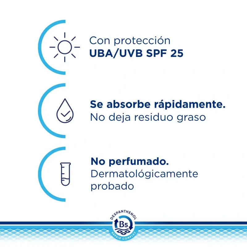 Este creme, para além de ser um poderoso hidratante, tem também a capacidade de proteger a pele dos raios solares, uma vez que possui um fator de proteção solar de 25+, o que reduz a possibilidade de queimaduras solares, o aparecimento de manchas ou hiperpigmentação, bem como as rugas que surgem com o envelhecimento.