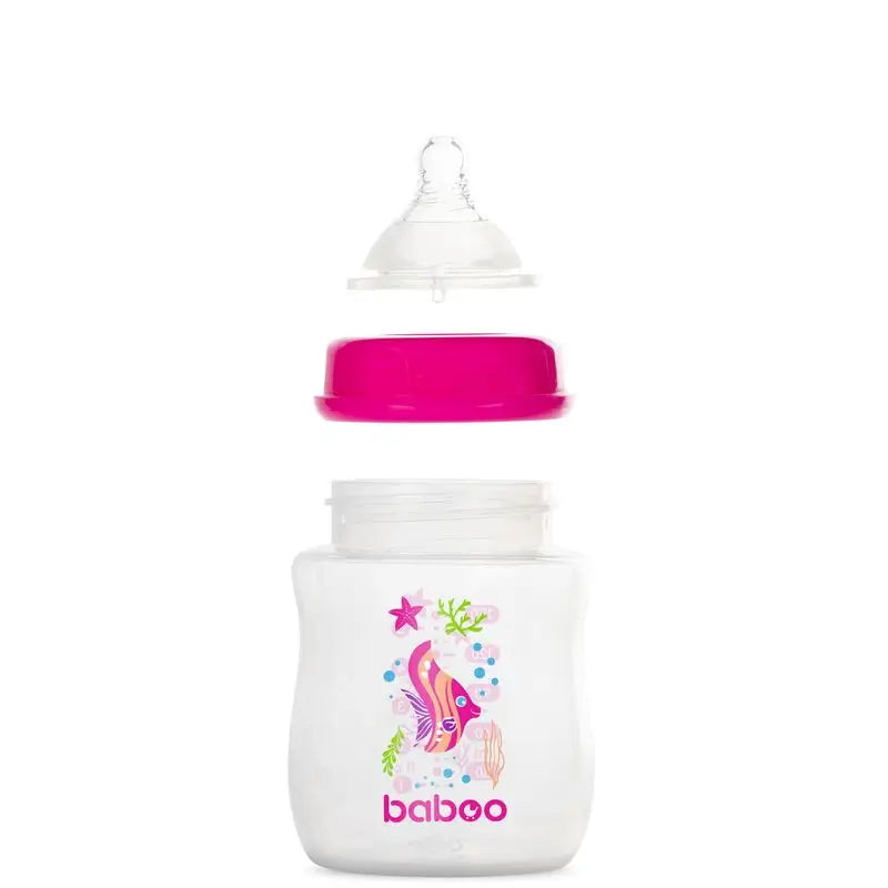 O biberão de gargalo largo Baboo é uma grande ajuda para os pais quando alimentam o seu bebé. A tetina do biberão é feita de silicone médico macio e de alta qualidade. A chupeta tem uma forma anatómica, o que evita a acumulação de ar na barriga e, ao mesmo tempo, protege o bebé de sensações desagradáveis. - O biberão é durável, seguro e transparente. - Forma ergonómica concebida para facilitar a utilização ao segurar, encher e limpar. - A tetina assegura um fluxo suave de leite, imitando o processo natural de alimentação. - Capacidade: 250 ml. - Para bebés a partir dos 3 meses. - Sem BPA.