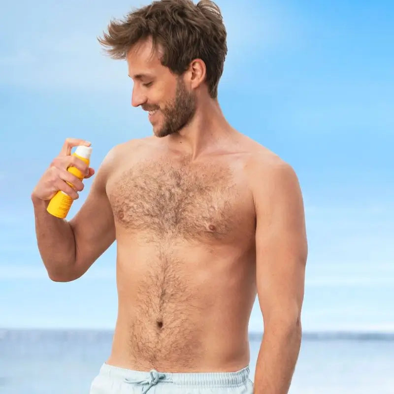 Produto resistente à água, dermatologicamente testado, não comedogénico que é pulverizado sobre a pele e não precisa de ser espalhado.