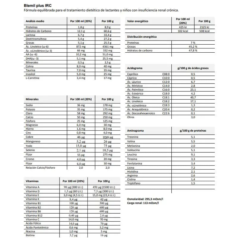 Esta fórmula especial de Blemil é ideal para estes casos, pois fornece a normoproteína completa e a dieta normocalórica que o bebé com insuficiência renal (com ou sem diálise) necessita.