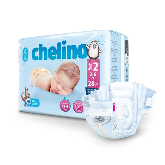 CHELINO WIPE T-2 R. BORN B28. Fralda de bebé descartável especialmente concebida para a proteção e o cuidado da pele do bebé, proporcionando conforto e liberdade de movimentos em todas as fases de crescimento. O tamanho 2 é adequado para bebés com peso entre 3 e 6 quilos.