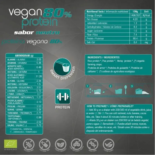 Vegan PROtein+ (660g) é pura proteína de ervilha micronizada, pelo que a sua textura é única, sendo muito fina e nada granulosa. É um produto único no mercado das proteínas vegetais devido à sua incrível textura e sabor, de tal forma que quando a tomamos não acreditamos que estamos a tomar uma proteína vegetal. Para além disso, é enriquecida com aminoácidos essenciais para ter um aminograma semelhante ao da proteína Whey. Sem alergénios