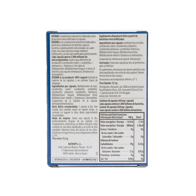 Diedam cápsulas probióticas entéricas - lactobacillus, bifidobactérias e inulina é uma fórmula que contribui para a regulação do sistema digestivo. O suplemento alimentar tem probióticos que são microorganismos que também ajudam a promover o equilíbrio do tracto intestinal.