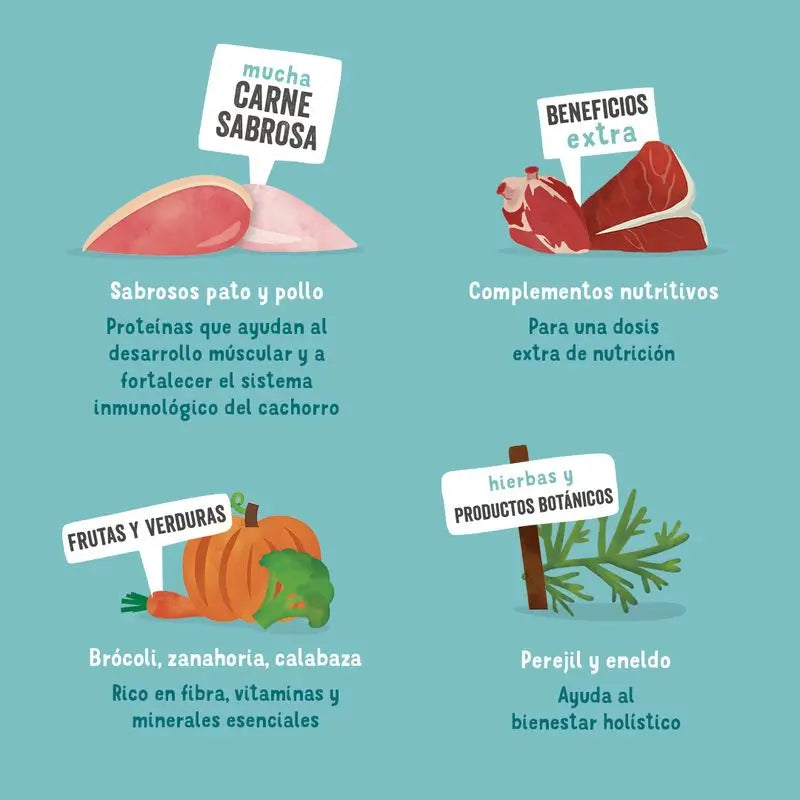 Também tem outros ingredientes principais, como brócolos, cenoura e abóbora. Um alimento delicioso e saudável para cachorros preparado diretamente com pato desossado e frango desossado sem aditivos, pelo que contém as melhores proteínas.