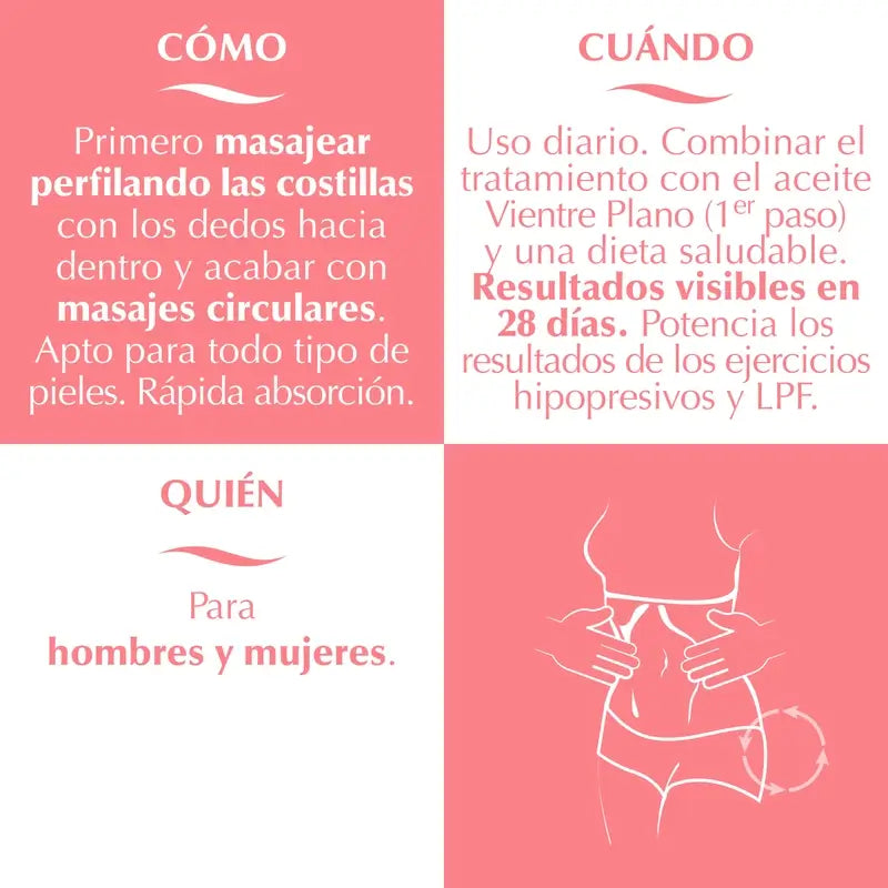Massajar no sentido das costelas com os dedos e terminar com massagens circulares. Combinar o tratamento com o óleo Intensive Flat Belly (primeiro passo) para obter um abdómen definido e completar a sua rotina de exercícios. Utilizar regularmente e combinar com uma dieta saudável.
