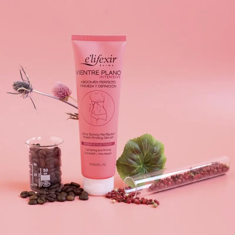 Elifexir Dermo Sérum Vientre Plano Intensive é um potente sérum adelgaçante concentrado em formato gel creme com função adelgaçante que define e reduz a zona abdominal, promovendo eficazmente a queima de gorduras ao mesmo tempo que estimula a produção de colagénio e elastina, proporcionando firmeza e suavidade na zona abdominal. A combinação de ingredientes do creme Elifexir Flat Belly Intensive proporciona uma pele mais firme, definida e tonificada. Formulado com SLIMEXIR®, Pimenta Rosa, Cafeína, Centella asiatica e óleos essenciais de Limão, Gerânio e Toranja Branca, que potenciam os resultados dos exercícios hipopressivos e do Low Pressure Fitness (LPF).