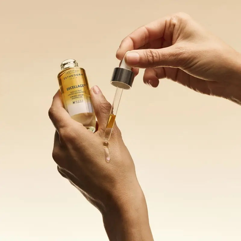 O Óleo de Noite Excellage actua em profundidade para ressincronizar o ritmo natural da pele, permitindo-lhe regenerar-se e fortalecer-se durante o sono.