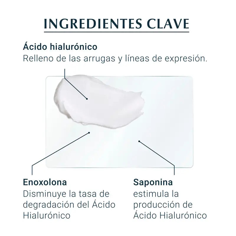 Contém uma fórmula única que reactiva naturalmente a produção de ácido hialurónico, preenche as rugas e protege a pele dos raios solares. Um creme de elevada tolerância que deixa a pele suave e pode ser utilizado mesmo sob a maquilhagem. Além disso, é não comedogénico e ligeiramente perfumado.