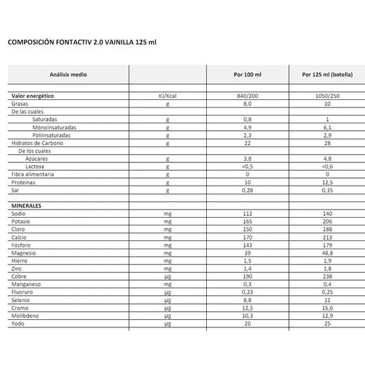 Água, proteínas do leite, maltrodextrina, óleo de colza, dextrina, inulina, emulsificante (mono e diglicéridos de ácidos gordos), amido modificado, citrato trisoleico, citrato de magnésio, citrato de magnésio.citrato, citrato de magnésio, cloreto de potássio, cloreto de potássio, cloreto de sódio, fosfato de potássio, óxido de magnésio, pirofosfato férrico, sulfato de zinco, selenito de sódio, sulfato de cobre, sulfato de manganês, sulfato de manganês, cloreto de sódio, cloreto de potássiofluoreto de sódio, cloreto de crómio, iodeto de potássio, iodeto de potássio, molibdato de sódio, aromatizantes, cloreto de colina, corantes (beta-caroteno), ácido ascórbico, ácido pantoténico, vitamina B6, niacina, vitamina B6, niacinaácido nic, vitamina B6, niacina, vitamina B1, vitamina B2, vitamina A, ácido fólico, vitamina E, biotina, vitamina K, vitamina D, vitamina B12, edulcorante (acessulfame K), estabilizador (carragenina).