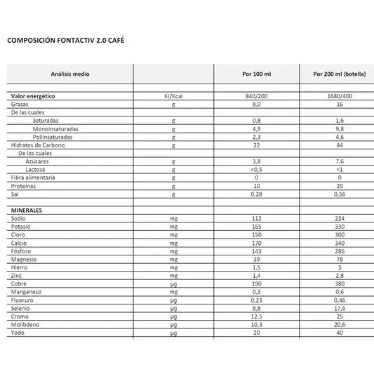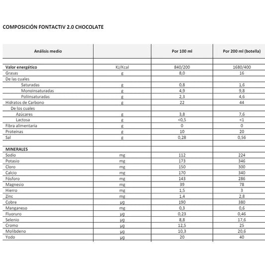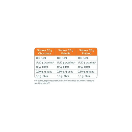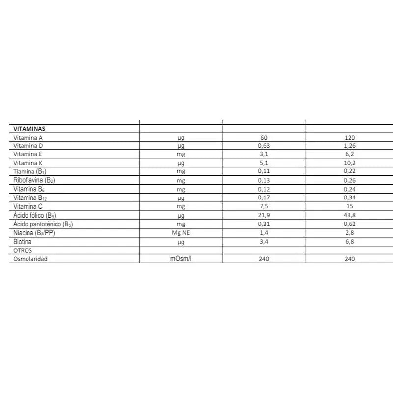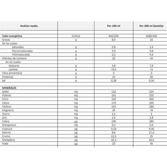 Este alimento dietético é notável pela sua densidade calórica de 1,1 kcal/ml. Além disso, a sua fórmula não inclui lactose, açúcar ou glúten. É hiperproteico (14 g / garrafa). Vem numa apresentação de 24 unidades, cada uma contendo 200 ml.
