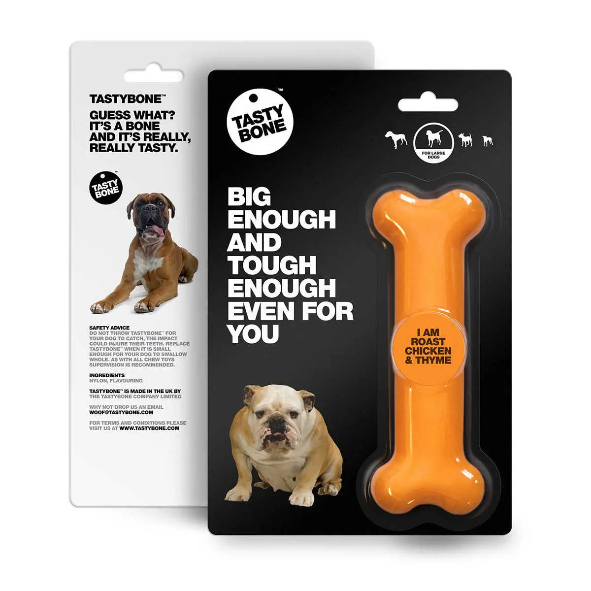 Tasty Bone Roast Chicken Thyme flavour Large é um brinquedo para mastigar de grandes dimensões com um autêntico sabor a frango assado e tomilho. Proporciona uma mastigação resistente e satisfatória para cães de grande porte.