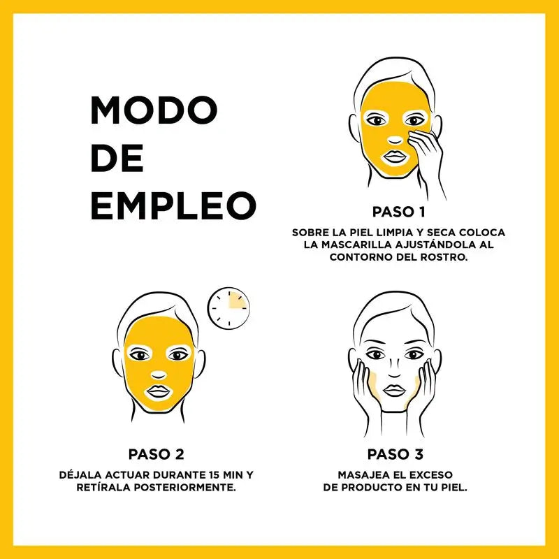 Fácil de utilizar: desdobrar a máscara, aplicar na pele limpa, retirar a película protetora e deixar atuar durante 15 minutos. Retirar a máscara e massajar cuidadosamente o rosto ou utilizar um disco de algodão para absorver o produto restante.