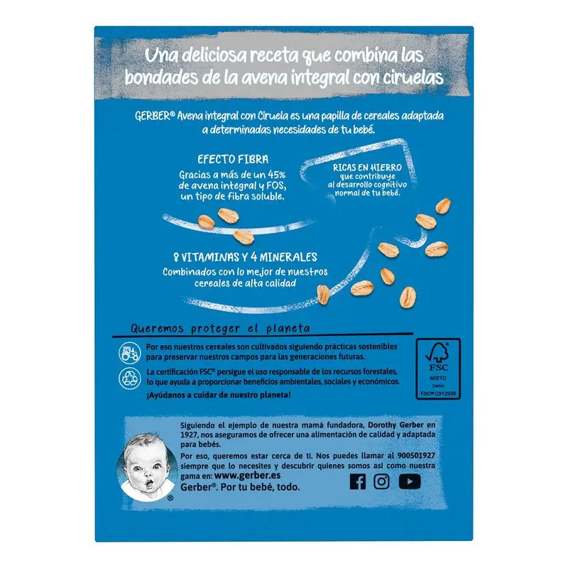É uma papa Gerber com ameixa e aveia integral com elevado teor de fibras, que é utilizada como alimento complementar para bebés a partir dos 6 meses de idade. A fibra solúvel presente na sua formulação contribui para um melhor trânsito intestinal e reduz a probabilidade de obstipação. A sua textura suave permite que seja facilmente diluída sem grumos. Tem também um sabor muito agradável.