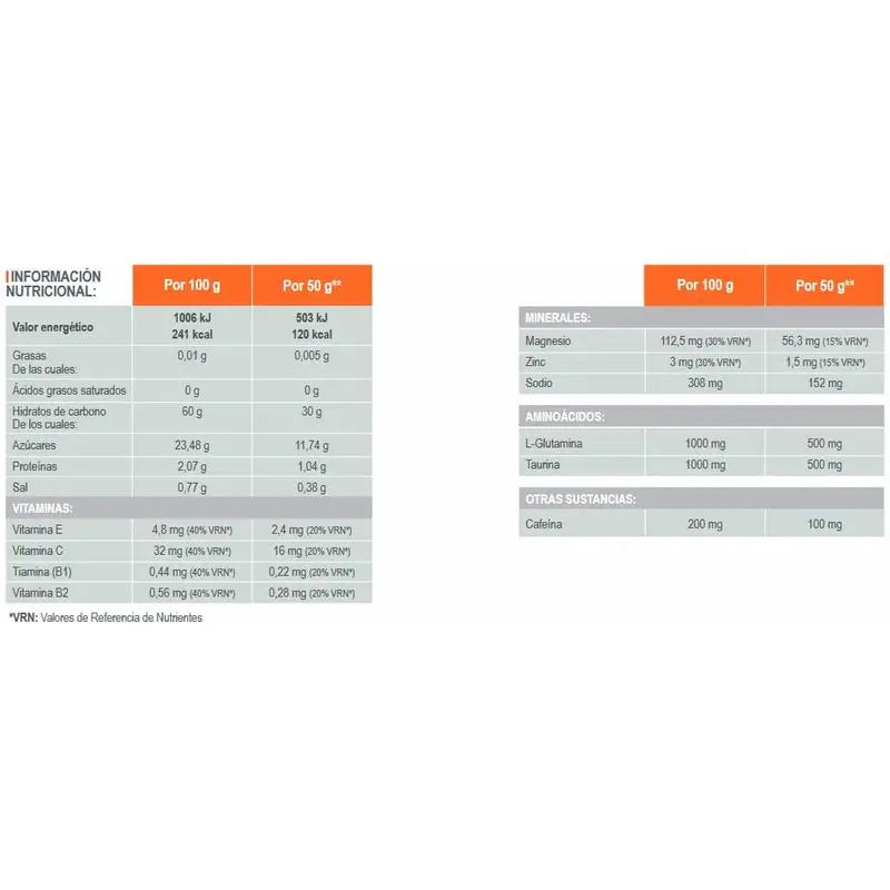 O sódio ajuda a manter a hidratação, o zinco e o magnésio ajudam a prevenir o cansaço e a fadiga, e as vitaminas C e E actuam como poderosos antioxidantes. Além disso, as suas vitaminas B apoiam o metabolismo dos macronutrientes. Este gel também contém doses adequadas de cafeína para manter o estado de alerta. Este produto é livre de corantes artificiais, não contém gordura, lactose ou glúten e é adequado para veganos.