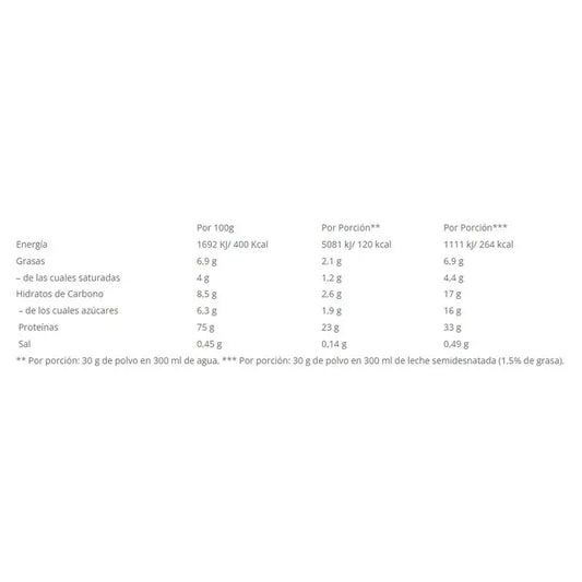 Este produto é consumido sob a forma de um batido de alta proteína. Cada porção fornece cerca de 25g de proteína de valor biológico. Além disso, contém uma elevada quantidade de aminoácidos essenciais. É pobre em gordura, açúcares e sem glúten, tornando-o um produto ideal para diabéticos e celíacos. Como suplemento alimentar, está em conformidade com duas normas previstas: