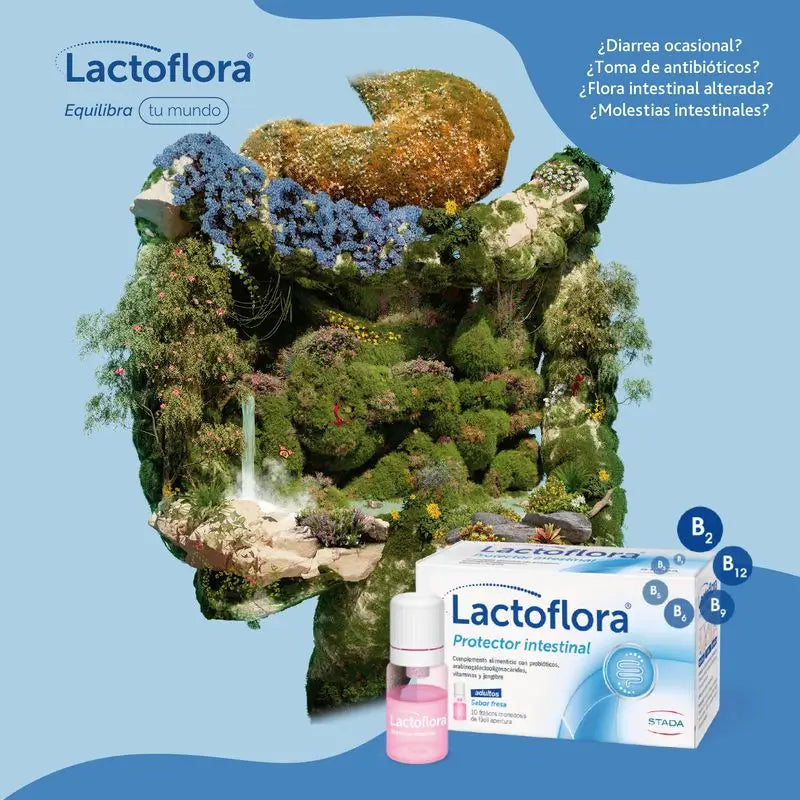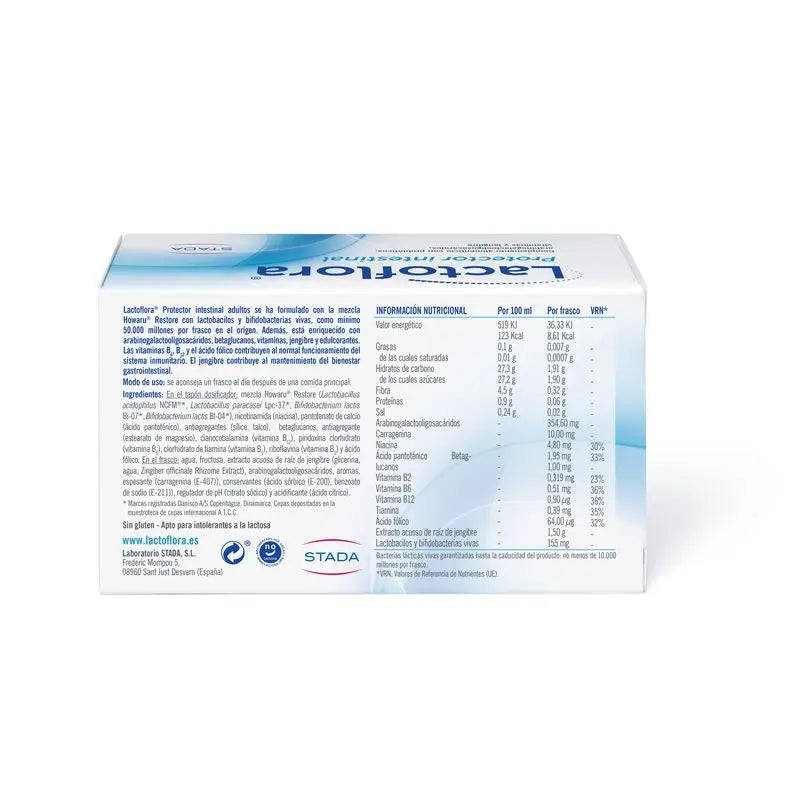 Lactoflora Intestinal Protector. Recomenda-se que se tome 1 frasco logo após a refeição principal. Siga as instruções na caixa para uma correcta administração. Se preferir, pode ser misturado com um líquido não aquecido. Estudos clínicos mostram que 7 dias de tratamento com Lactoflora Intestinal Protector ajuda a reequilibrar a flora bacteriana.