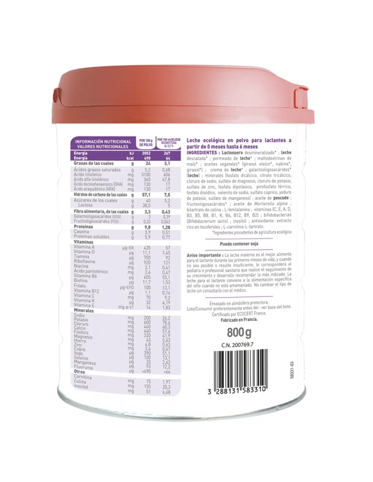 Sais lícicos de ácido ortofosfórico, L-triptofano, carbonato de magnésio, carbonato de cálcio, L-histidina, sulfato de zinco, sulfato ferroso, vitamina C (L-ascorbato sulfónico, 6-palmitato), cloreto de potássio, cloreto de potássio, cloreto de potássio, L-histidina, sulfato de zinco, sulfato ferroso, vitamina C (L-ascorbato sulfónico, 6-palmitato).sulfato de príon, vitamina A (acetato de retinilo), tiamina (cloridrato de tiamina), iodato de potássio, vitamina B6 (cloridrato de piridoxina), ácido fólico, selenito de sódio, vitamina K (fitomenadiona), sulfato de manganês, vitamina D (colecalciferol), D-biotina, vitamina B12 (cianocobalamina). * de agricultura biológica. 1 contém DHA (conforme exigido pela legislação para todas as fórmulas para lactentes). O DHA pertence à família dos ácidos gordos ómega 3.