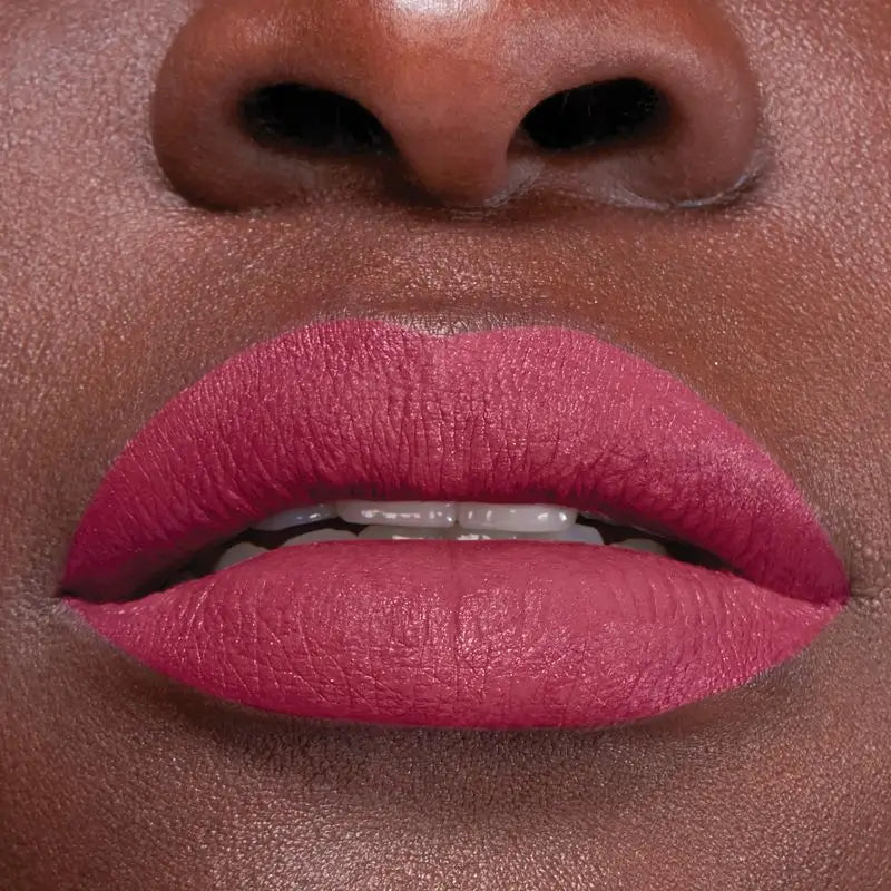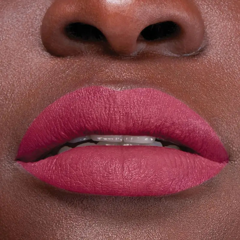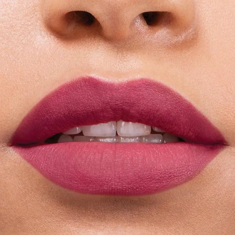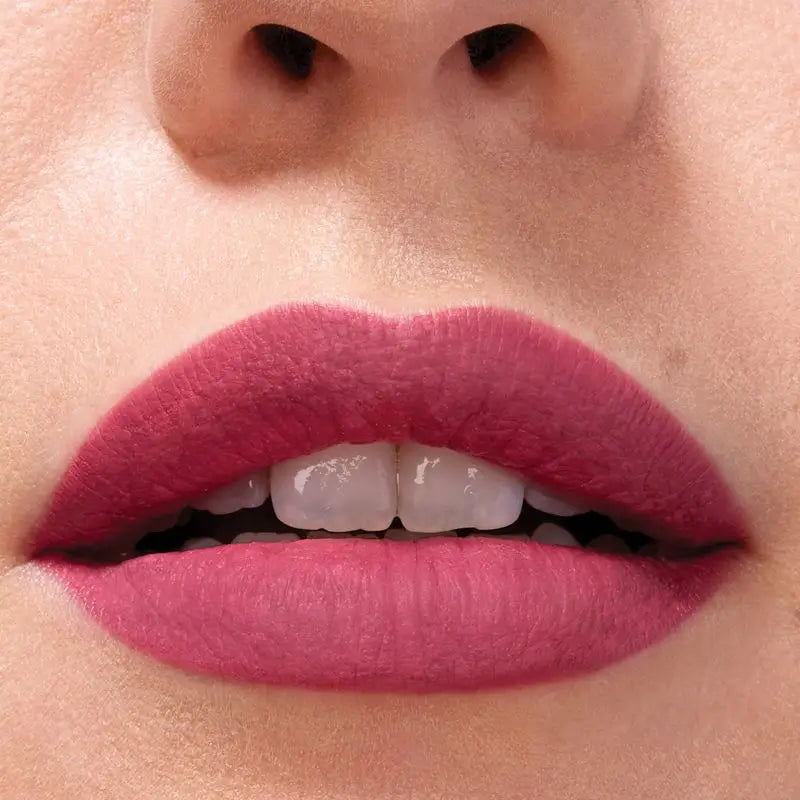 Acabamento mate nos lábios com a cor de tinta mais saturada. Efeito de tinta líquida que não seca.