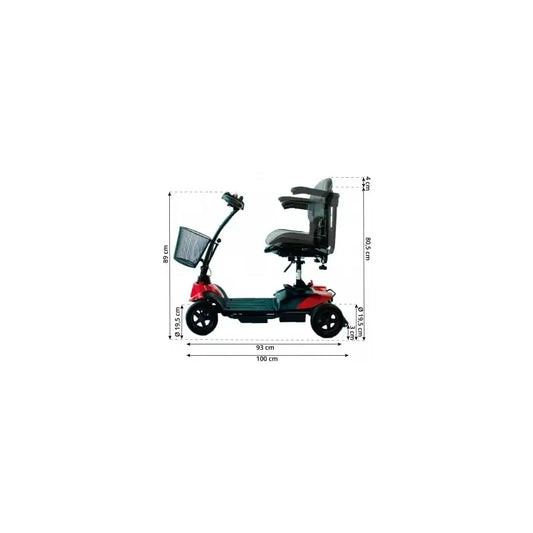 Principais características da trotinete eléctrica para pessoas com deficiência: Tem um design focado no conforto onde podemos encontrar: Cesto frontal que permite colocar qualquer objecto que o utilizador transporte, permitindo-lhe ter total liberdade nos braços para conduzir. Guiador dobrável. Assento amovível. Interruptor on/off e regulador de velocidade que favorece o controlo sobre a scooter. Apoio de cabeça rebatível e apoios de braços reguláveis em largura e inclinação garantem ao utilizador uma condução relaxante e confortável. Os estofos, o pára-choques e o farol de qualidade superior têm um novo design. Pode adquirir um ou dois espelhos retrovisores para a sua scooter Libra ligando para o serviço de apoio ao cliente. Dimensões e peso: Comprimento total: 128 cm. Largura total: 61 cm. Altura total: 111 cm. Peso com as baterias: 87,9 kg. Peso da bateria: 24,7 kg. Peso máximo suportado: 135 kg. Rodas: Rodas dianteiras e traseiras: 26 cm de diâmetro. Rodas pneumáticas. Assento: Tipo de assento: Assento estofado dobrável. Largura do assento: 45,5 cm. Encosto médio giratório com apoio de cabeça e mecanismos de deslizamento do assento. O assento pode ser rodado 45, 90, 135 e 180 graus. Antes de rodar o assento a 180 graus, o ângulo de direcção deve ser ajustado para evitar interferências entre o encosto do assento e a direcção. Características de utilização da trotinete eléctrica para adultos: Velocidade máxima: 8 km/ph. Inclinação máxima de subida: 12°. Curva de subida: 5 cm / 2 °. Raio de viragem: 152 cm / 59,8 °. Pára-choques e farol disponíveis. Tem a possibilidade de acrescentar um ou dois espelhos retrovisores à sua scooter Libra, contactando o serviço de apoio ao cliente. Características técnicas da trotinete eléctrica de 4 rodas Libra: Travão electromecânico: pára a trotinete quando o acelerador é libertado. Motor: 500W, 3400 rpm. Electrónica: Interruptor on/off, indicador do nível da bateria e regulador de velocidade. Bateria: Bateria: Bateria de gel (2) 12V. 36Ah. Recarregável e amovível para facilitar o transporte. Autonomia: 30 km (aproximada, em linha recta e em função do peso do utilizador). Carregador de bateria: 5A no exterior do veículo. Método de carregamento: Retire o invólucro traseiro por baixo do assento, verá um botão preto que activa a bateria, prima-o e volte a colocar o invólucro. Ligar o cabo do carregador à porta de carregamento situada na parte inferior do guiador. Indicador de bateria do guiador: Luz vermelha: indica que deve ligar a scooter e ligar a bateria. Luz laranja: aparece durante o carregamento. Luz verde: o carregamento está concluído. Gostamos desta trotinete eléctrica para deficientes devido a: A sua segurança: a sua alavanca de neutro com a qual se pode desactivar os sistemas de tracção e de travagem da trotinete, permitindo que outra pessoa a empurre. O seu desempenho: 30 km de autonomia com um motor de 500W. O seu design prático e moderno. As trotinetes eléctricas para deficientes são as companheiras perfeitas para as pessoas com mobilidade reduzida.