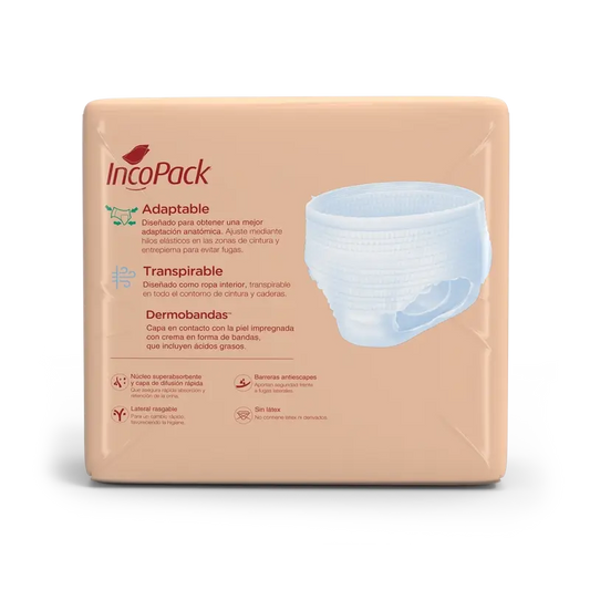 A sua superfície exterior é feita de um tecido não tecido, que é muito agradável ao toque. Além disso, tem uma almofada de pernas em forma anatómica para uma mobilidade e conforto ininterruptos em todos os momentos. O interior da fralda é tratado para ser antibacteriano, minimizando o risco de infecção devido à proliferação bacteriana.