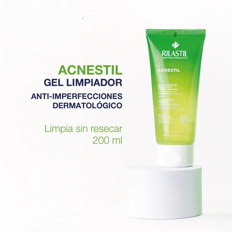 Rilastil Acnestil Gel é formulado para limpar a pele que tende a produzir grandes quantidades de sebo ou sofre de pontos negros e outras manchas causadas pela acne.
