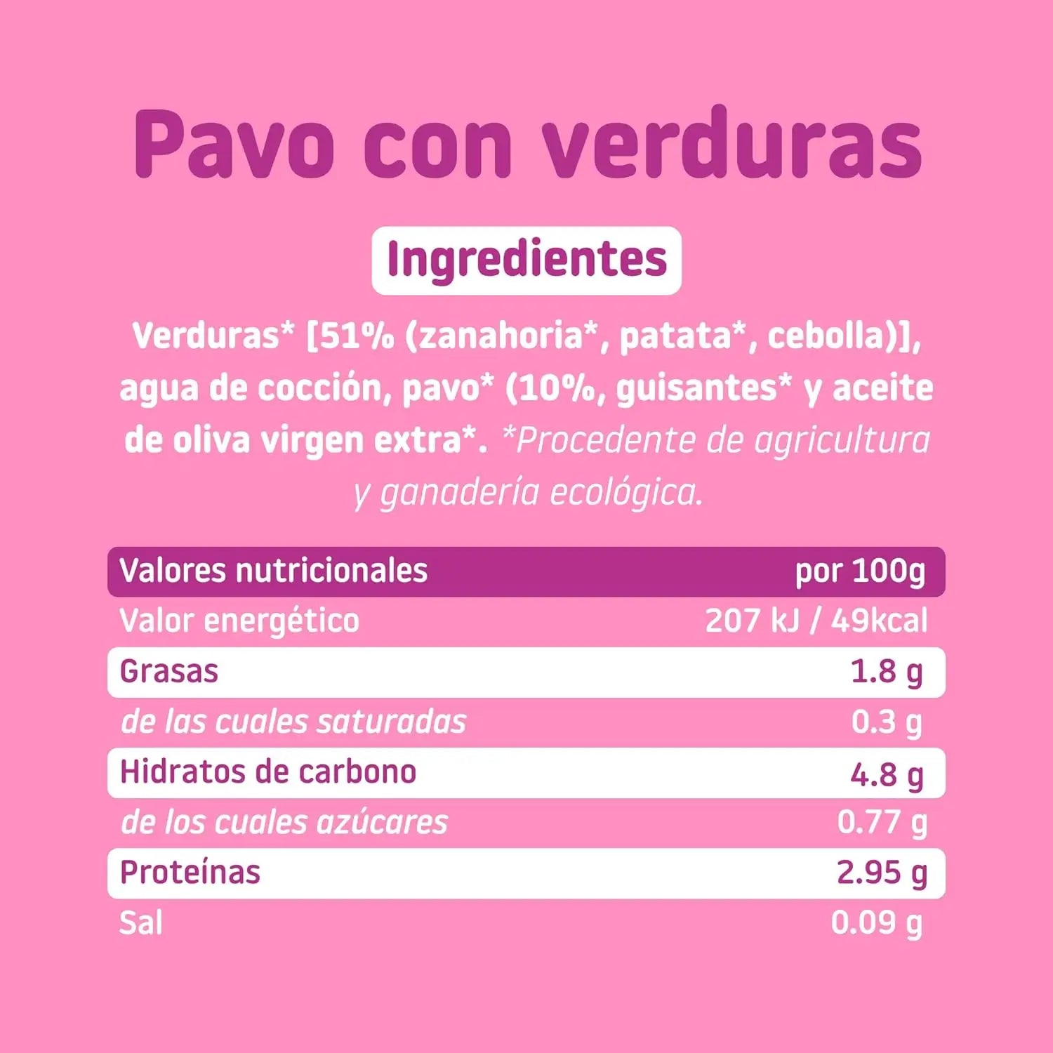 Produtos hortícolas [45% (cenoura, batata, cebola)], água de cocção, peru (10%), ervilhas e azeite virgem extra (1%). *da agricultura biológica.