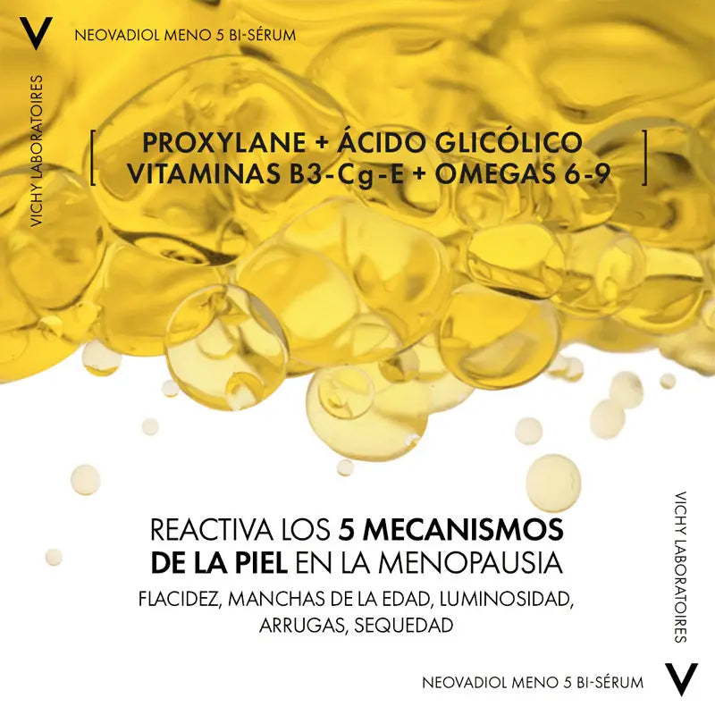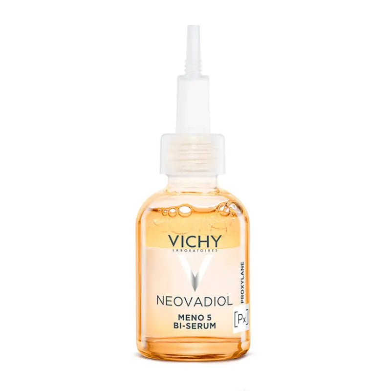 V ichy Neovadiol Serum é um tratamento anti-idade para o cuidado da pele durante a menopausa, uma altura em que a pele sofre alterações e começamos a notar alguns efeitos negativos. A hidratação, a elasticidade e a espessura perdem-se, pelo que começamos a ver rugas, manchas e secura. Graças ao sérum da Vichy , não terá de se preocupar com todas estas consequências. Contém Meno 5 BI, que combate o fotoenvelhecimento e a flacidez, pelo que a pele fica muito mais luminosa e saudável.