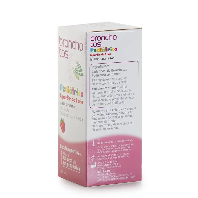 BRONCHOTOS Xarope Pediátrico 200 ml é uma solução formulada com ingredientes naturais que alivia a tosse das crianças sem necessidade de lhes dar medicamentos químicos. O seu consumo adequado reduz o desconforto que as crianças sentem ao tossir, o cansaço, a fadiga, os despertares noturnos e ajuda a eliminar o muco que se acumula nos brônquios. As qualidades anti-inflamatórias e expectorantes do extrato seco de marshmallow são utilizadas na preparação deste xarope pediátrico.
